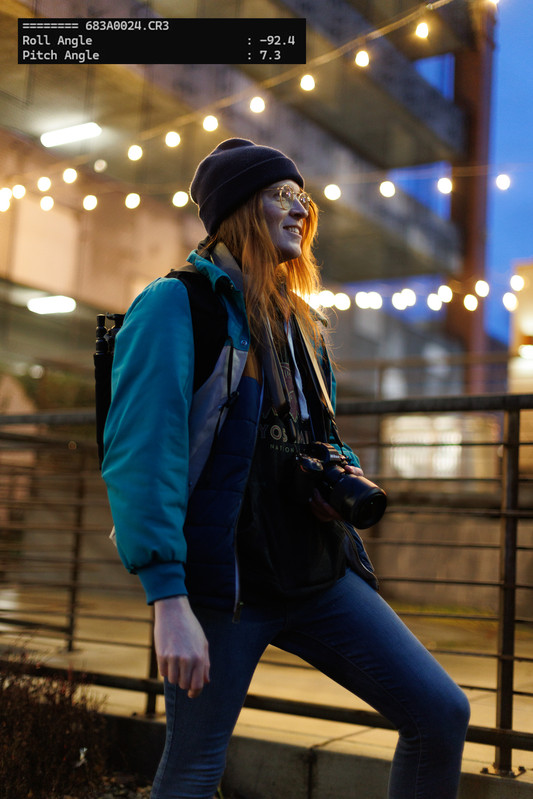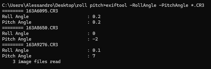 I valori sono in gradi. A quanto ho capito "Pitch" è l'inclinazione verticale (verso il basso/alto), "Roll" quella orizzontale (orizzonte storto...). Però se tieni la macchina perfettamente orizzontale ma stai facendo un'inquadratura verticale, il valore di Roll è -90. Ecco due esempi i.postimg.cc/JhXPdJ87/683A0024-1.jpg i.postimg.cc/BQwpSNQc/683A2643-1.jpg Infine questi sono tutti i TAG teorici che Canon potrebbe utilizzare nei metadati, secondo Phil Harvey (autore di ExifTool)... exiftool.org/TagNames/Canon.html |