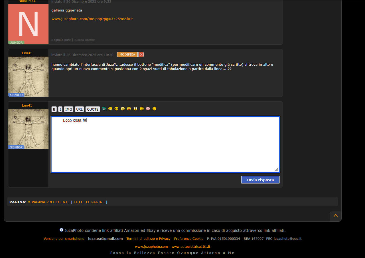 hanno cambiato l'interfaccia di Juza?....adesso il bottone "modifica" (per modificare un commento già scritto) si trova in alto e quando apri un nuovo commento si posiziona con 2 spazi vuoti di tabulazione a partire dalla linea...!?? |