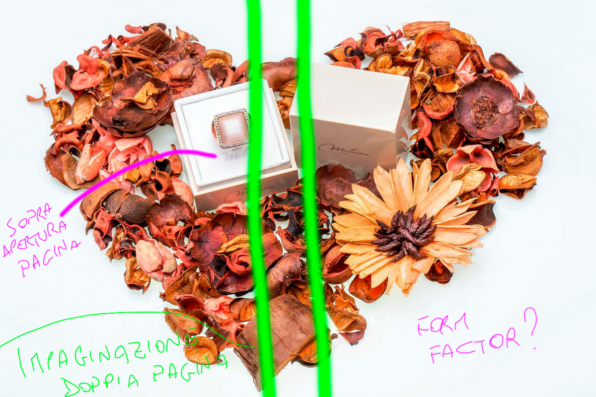 E' un errore enorme, non si può saturare più il set rispetto al prodotto, altrimenti il soggetto della vendita diventano i fiori. C'è un anello minuscolo, spento, in mezzo a 2000 rose ipersature.