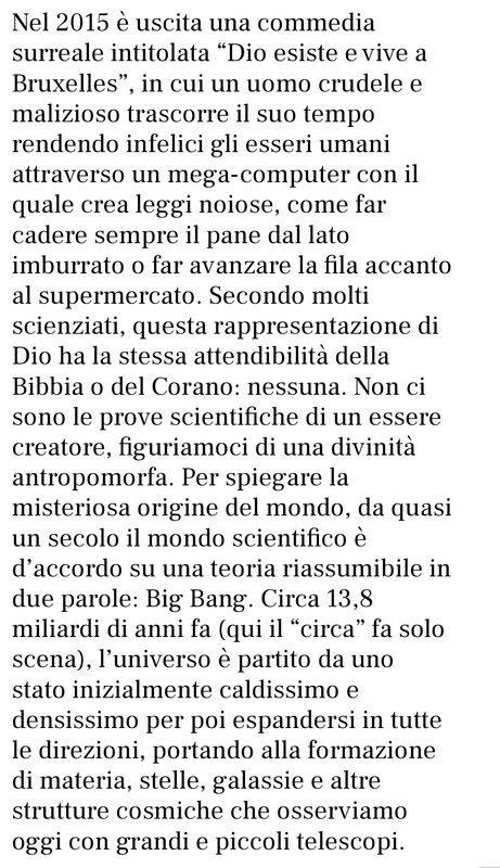 “ “ D'altronde ci sono questioni che la scienza non potrà mai risolvere ? „ Appunto. Suuponenti e presuntuosi esclusi. “ Per molto tempo, gli scienziati hanno calcolato l'età dell'Universo misurando il tempo trascorso da un ipotetico Big Bang iniziale, „ Ipotetico Bing Bang..... “ Gupta ha costruito un nuovo modello secondo cui l'Universo di anni ne avrebbe 26.7 miliardi, ovvero il doppio rispetto alla stima attuale. „ Avrebbe? “ Se l'universo esistesse da sempre e non ci fosse alcun inizio, ma solo un'evoluzione chiamata Big Bang, come reagireste? Secondo uno studio condotto dal fisico Bruno Bento dell'Università di Liverpool, l'universo non avrebbe avuto alcun inizio, ma si ritiene sia sempre esistito e che solo di recente si sia evoluto in quello che abbiamo sempre chiamato Big Bang. „ Non avrebbe? “ L'universo è iniziato con un buco bianco? La nuova teoria sul Big Bang „ Buco bianco? Il bazar delle teorie.Prendi tre paghi due. |