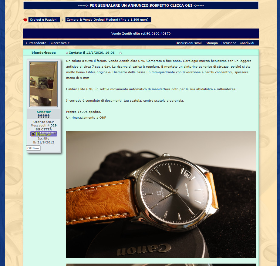 Quello è più vecchio, vedi dal vecchio simbolo della Zenith (ora una stellina), è più piccolo (36mm vs 40mm). Credo che l'ultra thin sia molto più fine. Costo è maggiore però (almeno io l'ho comprato per il doppio di quel prezzo, usato) È molto bello anche questo, esteticamente è più discreto trovo |