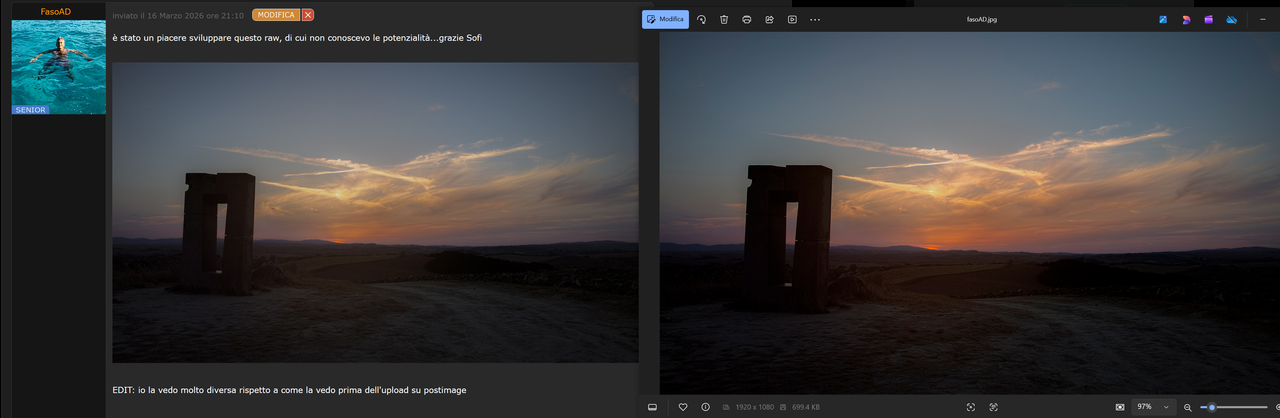 Ho voluto provare il funzionamento del gioco con il nuovo sistema, per me promosso a pieni voti. ( una letta alle regole/istruzione lo fa/farà funzionare ancora e sempre meglio ) Nessun ridimensionamento, mi piace così il panorama, anzi con una focale più grandangolare mi sarebbe piaciuto ancora di più. Anche un paio di scatti poi da unire ci sarebbe stato bene, ma son gusti personali. Di sicuro non era questo quello che Sofi ha visto, ho cercato l'effetto e non la realtà, poi riuscirci è un altro discorso. Non sarò tra coloro che commentano perchè non saprei da dove cominciare, tutte le PP hanno il loro perchè Visionarla qui è molto diversa da come la vedo sul programma di sviluppo, ma va bene così. Io a differenza di Stefano la vedo quì, più scura. Sarò un caso a parte, ma non l'ho trovato un file ostico da lavorare, certo i file della mia R3 e Leica sono più addomesticabili, ma anche questo ha le sue chanse |