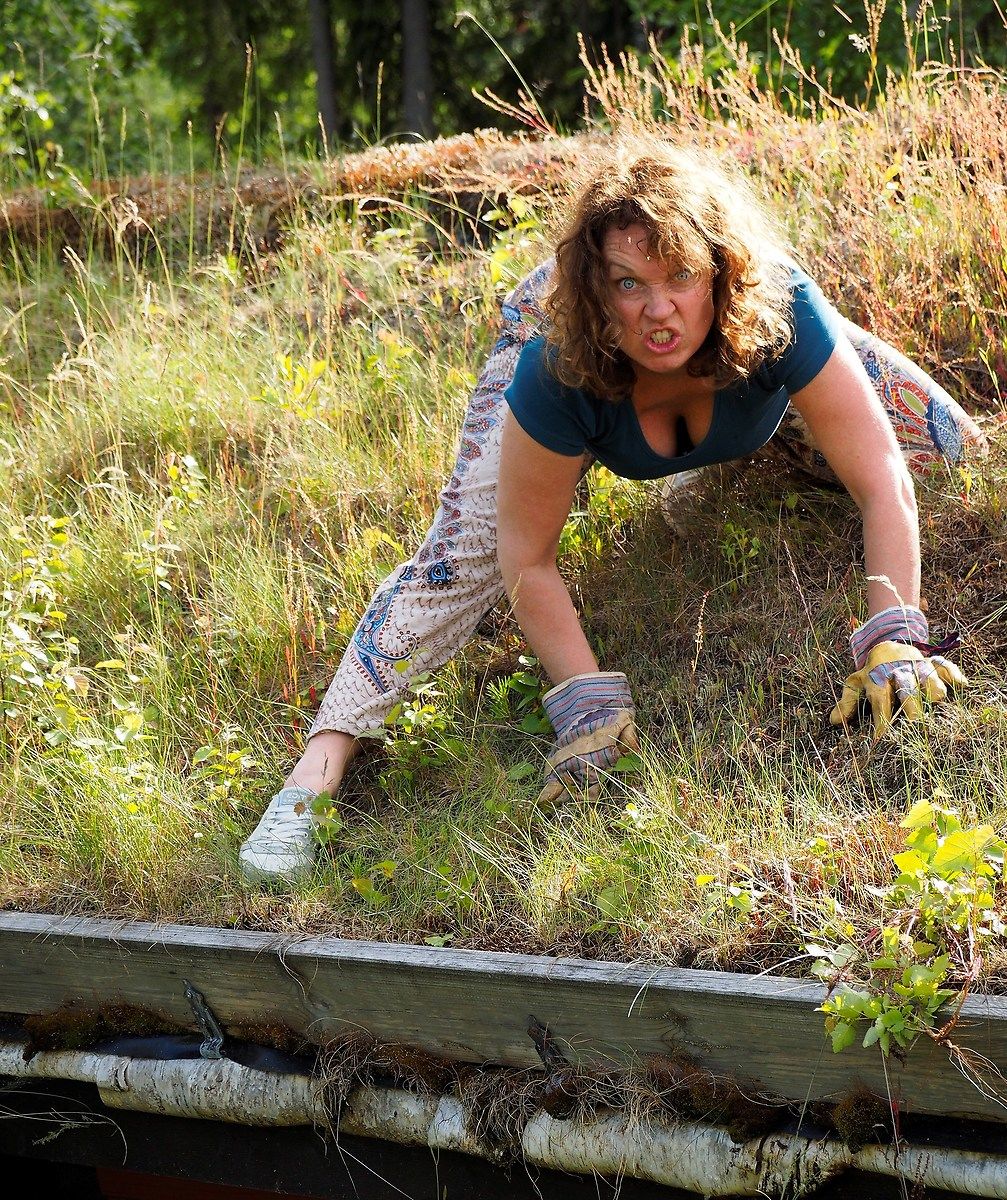 Spiegazione sul titolo. Mia moglie si trova sul tetto di una specie di baita, che in norvegese si chiamano "Hitter". Il tetto viene coperto da uno strato di terra e composto botanico, dove cresce l'erba. Questo per isolare la "hitta". Ogni anno bisogna togliere le erbacce e gli arbusti che possono danneggiare il tetto.