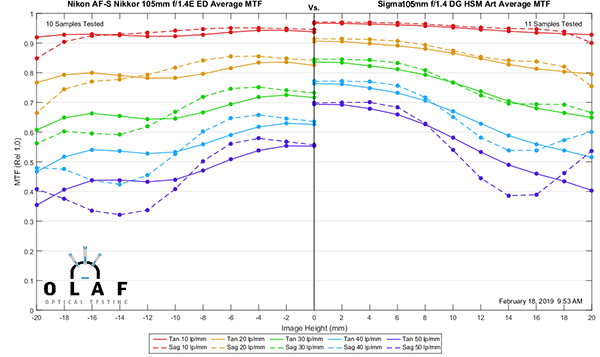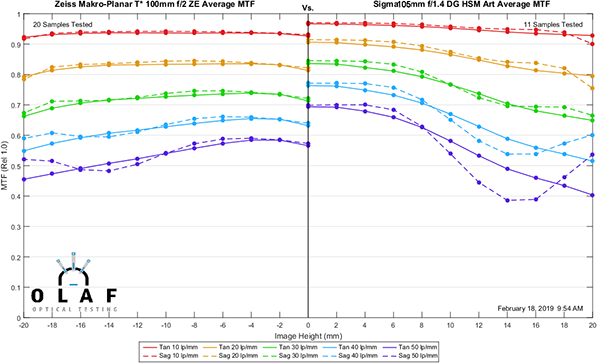 Qui sopra le MTF del Sigma 105 f1.4 @ f1.4 confrontate con quelle dello Zeiss Makro Planar si badi @ f2