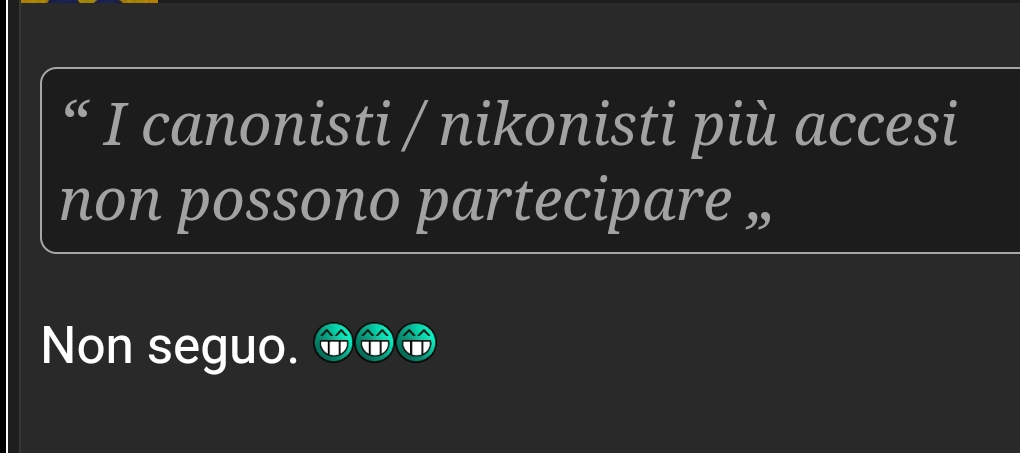 @Rocco sul diletto Faggin mi sono bloccato, principalmente perché introduce parole nuove che dimentico subito dopo. Può uno che ha preso la cantonata del Foveon svelare questa storia della coscienza? Per il MIO principio di induzione completa: NO. Anche tu confondi "centrare" con "entrar-ci"? Alla fine mi riduco alla filologia per capire il livello culturale di parecchi tromboncini di qui. Su Repubblica in linea un glorioso "insegnamo". Come fa uno a credere alle notizie ivi rivelate? Una fregnaccia cosmica qui su Juza è l'anelito al Foveon FF. Viene dal non avere capito come funziona un Foveon. D'altronde lo stato solido non è da tutti. Un tributo al capo di Chimico-Fisica Massimo Simonetta, un pioniere dello stato solido in Italia e purtroppo anche azionista di quella SIR che ha sfasciato la chimica industriale italiana (cfr. Porto Torres).