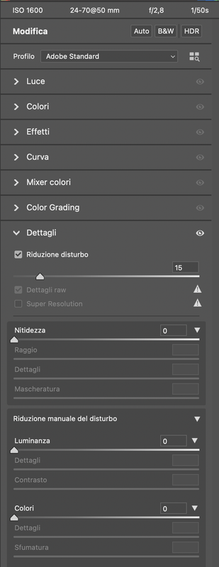 Un esempio a 1600 iso con riduzione rumore a 15 (di default è 50), quella creata in automatico da Camera Raw.