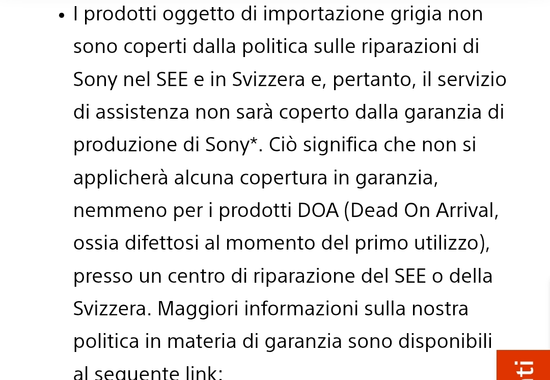 “ Lorenzo P Pare che anche x Sony valga lo stesso trattamento di assistenza applicato da Nital alle fotocamere import extra UE. „ ehm nel tuo screenshot (forse non l'hai letto) c'è scritto che non ripara in garanzia, io ti dico che se porti al principale centro di assistenza sony una macchina import, loro la riparano, tu paghi e chi te l'ha venduta ti manda i dindi che hai speso, con paypal a quanto dici invece nital (nei propri centri assistenza) non ripara proprio (neppure a pagamento) macchine nikon non nital l'anomalia di nital è che può decidere di non riparare cose non vendute da loro, questo perché è sia distributore che assistenza |