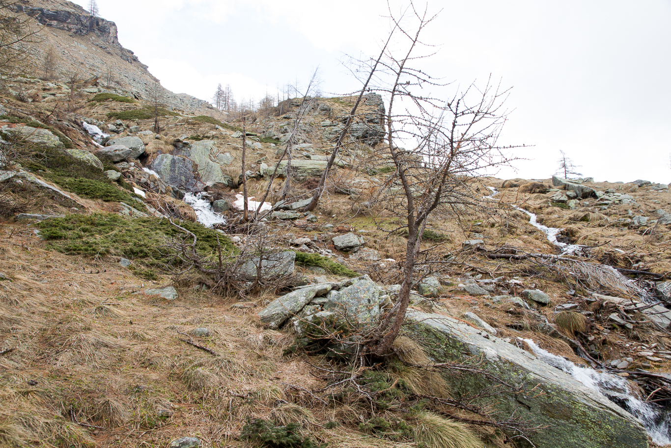 La traccia passa per le baite poi sale abbastanza ripida nel canalone fino a un cambio deciso di pendenza.