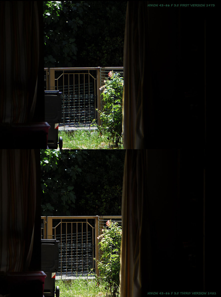 Confronto 1:1 tra i Nikkor 43-86. Sopra la primissima versione del 1973 ( Nippon Kogaku ) e sotto la terza del 1981, con schema ottico completamente diverso dalla prima. Qui su Nikon D200 ad 86 mm ed f 3.5.
