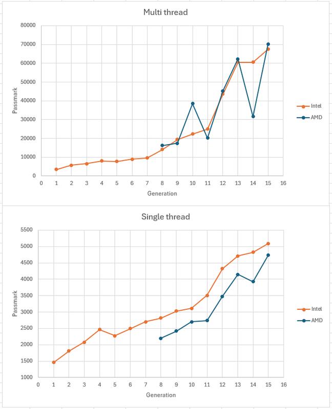 In merito al discorso upgradabilità, ho sempre trovato irritante la tendenza di Intel a cambiare socket ogni due anni. L'unica volta che sono riuscito a fare un upgrade generazionale è stato passando dal Celeron Mendocino, 300MHz @450Mhz, al Celeron Coppermine-128 566MHz@850MHz su Slot1, Coppermine era tramite adattatore da socket 370. Più avanti avrei potuto passare da Athlon64 X2 a Phenom, migliorando lato produttività grazie ai 4 core, mentre i giochi erano ancora praticamente single thread, ma EVGA pensò bene di non rilasciare il BIOS con i microcode aggiornati per le piattaforme AM2. Mi sono permesso di fare un grafico delle CPU desktop più performanti generazione per generazione. Per intel ho cominciato da Nehalem, AMD dai più recenti Ryzen. Ho cercato per quanto possibile di allineare temporalmente le generazione. I valori sono dal database di Passmark, e per i Ryzen ho guardato quando possibile le versioni X3D.