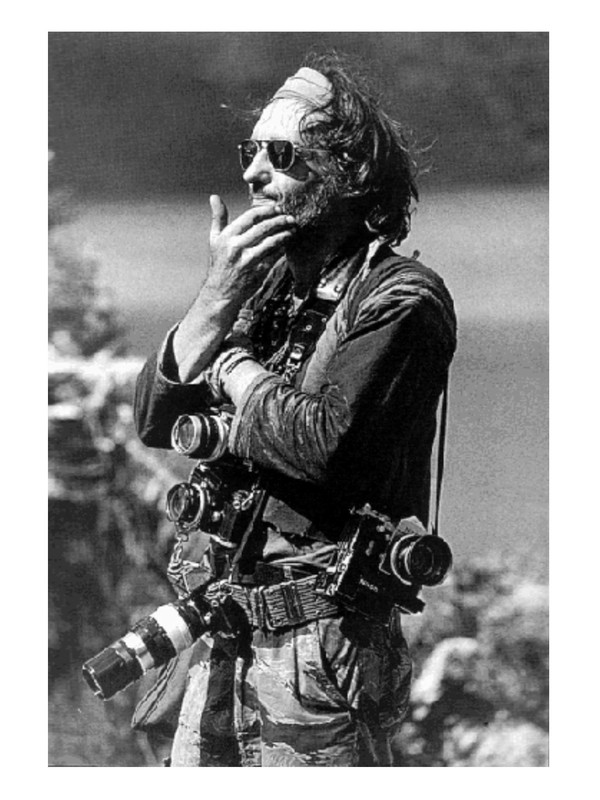 Quella che penzola dalla spalla sinistra è una Nikon F, quella più in basso delle tre che ha al collo di pare una Nikkormat, le altre due non riesco a distinguerle. |