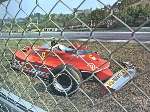 da questa foto, si capisce : è un incidente del pilota Villeneuve è in pista ad Imola (lo sfondo per molti appassionati è facilmente riconoscibile) è il 1980 perchè quella è una Ferrari T5 (facilmente riconoscibile da molti) sicuramente ha sbattuto violentemente al posteriore diciamo che già da sola ne racconta di cose sta foto che era pubblicata sul settimanale Autosprint |