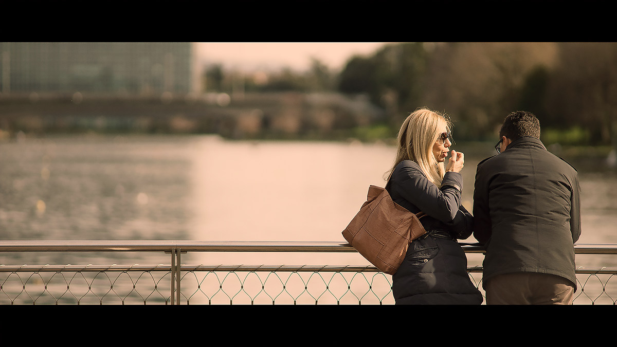 Per quanto riguarda il taglio, l'uomo secondo me dovrebbe avere qualche cm di respiro sulla destra. Io lo collocherei più o meno dove adesso c'è la donna. Ma il fotogramma originale lo spazio c'è l'ha?