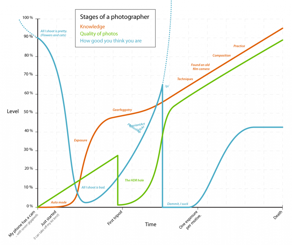 L'appagamento è una funzione composta di quelle indicate nel grafico. In mancanza di riscontri, sarebbe solo la "How good you think you are". Grazie ai forum e social entra in gioco anche la combinazione con "quality of photos". Per chi pubblica poco ed è solo curioso di conoscere le tecniche, anche knowledge ha un peso nella composizione. Manca totalmente la curva del fotocameraamatore, alias collezionista, che va trattato a parte. L'appagamento indubbiamente dipende dal rapporto con le aspettative, ma queste cambiano nel tempo. Una ricerca su google con parole chiave "stages photographer" conduce a diversi articoli che scompongono l'evoluzione delle aspettative in 5, 7 o 11 passaggi. Questo thread è di fatto una indagine statistica sulla fase che ciascuno attraversa e sull'allineamento che ha rispetto a quella fase. Es.: Se uno è nelle fasi primordiali (gear!) e si compra tutti gli obiettivi che desidera, è ovviamente appagato. Nel momento in cui migra verso lo stadio successivo, quegli obiettivi non lo soddisfano più. |
