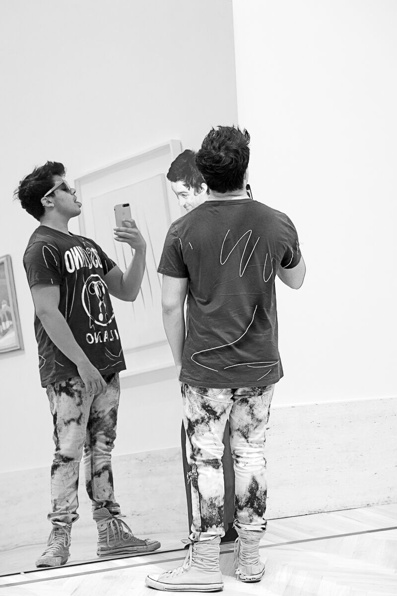 Lo specchio diventa un quadro in cui alla figura immobile (la fotografia serigrafata), si sovrappone il riflesso della sala e delle persone che stanno davanti al quadro specchiante.