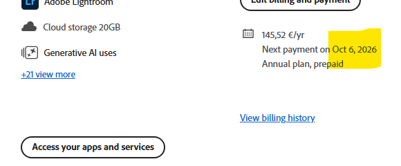 “ Riscatto il codice e stupido io lo inserisco subito nel portale dedicato, dico stupido perché ho una fatturazione attiva fino a gennaio 2026.. qualcuno sa dirmi cosa succede ora? „ Non preoccuparti Sims, se il piano è lo stesso (Lr + LrC) il tuo abbonamento si è prolungato di un anno e la data di scadenza sarà quindi gennaio 2027. Se il piano non è lo stesso (cosa che non sembra, da quello che dici) il nuovo si attiverà subito parallelamente a quello che avevi già. |