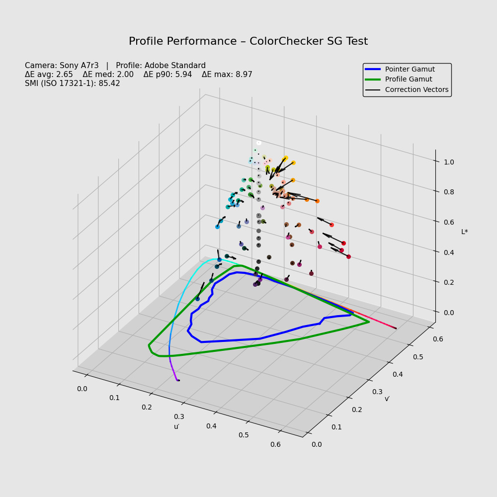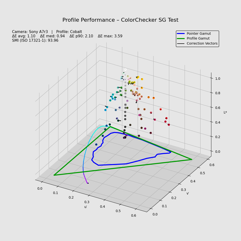 Le palline sono le posizioni di colore delle tacche di un SG, nella posizione in cui dovrebbero stare. I vettori neri sono dove vengono posizionati dopo lo stadio di colorimetria. Non si tratta di errori, perché sono troppo grandi per essere errori. Sono scostamenti voluti, un gamut compression che definire aggressivo è poco; e non lo stiamo osservando per campioni estremi, lo vediamo già nelle patch di un SG. Nello spazio più esterno la compressione è ancora più evidente. Cosa comporta tutto questo? Che l'informazione collassa. Per forza di cose. Non è soltanto un discorso di colore preciso o colore non preciso; qui sparisce proprio il colore. E non esiste tecnica di post-produzione che possa farla riapparire questa informazione persa. Nada, sparita, per sempre. Il danno è fatto a monte dei controlli utente. Questo è lo stadio di colorimetria del profilo spettrale, stessa fotocamera, stesso SG:
