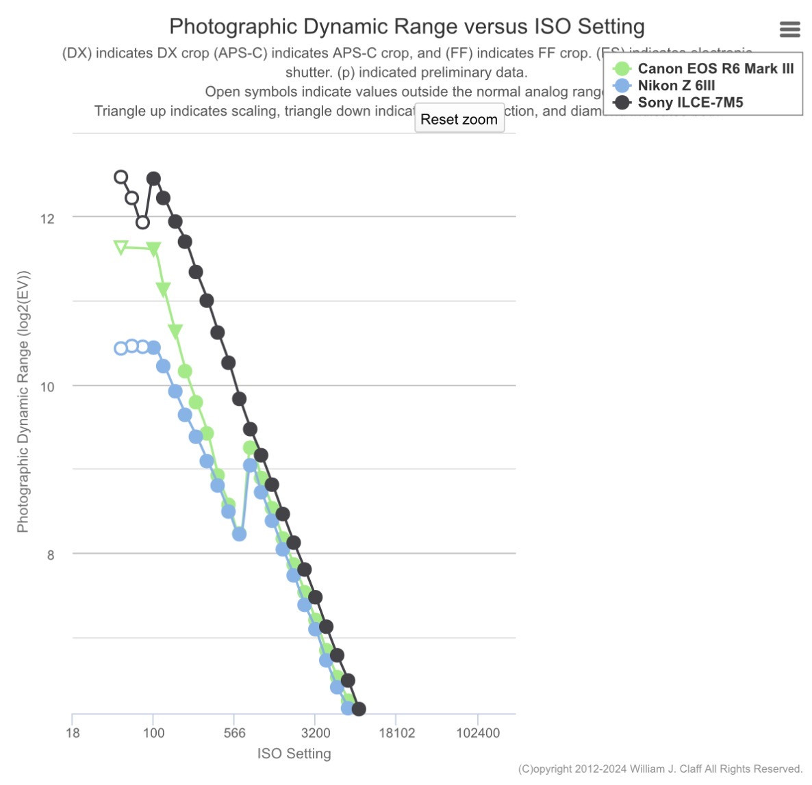 “ Guardando il grafico sembra che anche la R6 mark iii se la cava bene a 100 iso „ Filtra rispetto alle altre due. |