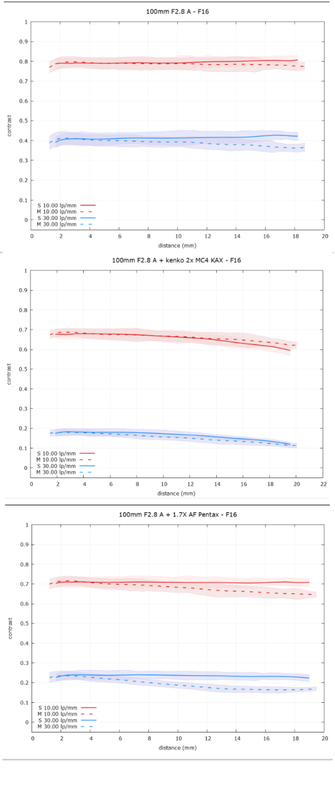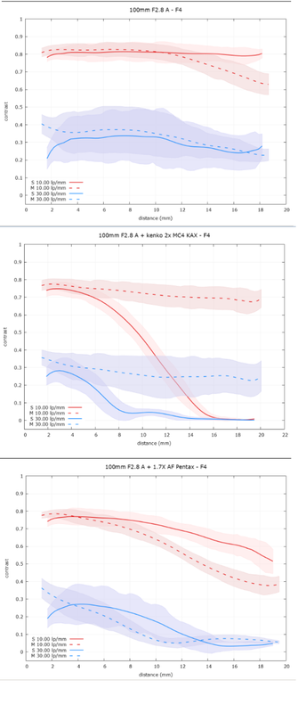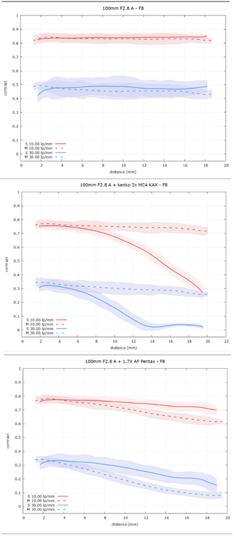 Senza alcuna velleità di eseguire misure che siano da considerarsi attendibili, cosa per altro chiarita nel sito di MTF mapper, ho voluto provare a vedere cosa ne usciva da questa applicazione. Non essendo al livello dei test ufficiali ho rinunciato in partenza a prendere in considerazione risultati quantitativi, ho puntato invece su risultati qualitativi mettendo a confronto due/tre obiettivi Pentax, vecchia serie, nelle stesse identiche condizioni di esposizione, illuminazione, inquadratura ecc. Ho pensato che la prova più facile con la quale iniziare potesse essere quella di confrontare un obiettivo con e senza duplicatori di focale. In questo caso la prova avrebbe dovuto mostrarsi evidentemente a favore dell'ottica senza duplicatore, specialmente se di scarsa qualità. In effetti i risultati di questo (ma anche di altre prove) si sono dimostrati credibili, almeno a me. Credibili fino a che punto? Non lo so, giudicate voi. I risultati mostrano, dall'alto al basso le prove con Pentax A 100mm F2.8 senza duplicatore, con duplicatore Kenko 2x MC4, con moltiplicatore Pentax 1.7x AF. Prove a distanza ravvicinata, ma credo che farò stampare una mira in grande formato per provare a distanze più elevate. La differenza è evidente e tutto sommato coerente con le mie aspettative. La fotocamera usata è Pentax K1D II con CCD da 36 MP. F4: