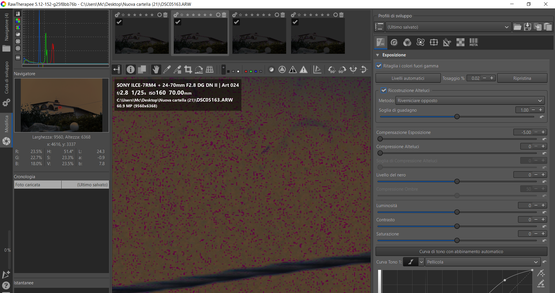 Oddio, però ora che vedo il file, quel 160 ISO qualcosa che non va ce l'ha (al di là della bruciatura da contatto con la superficie solare che però è comune anche agli altri 3 file). Qua con -4 EXP e -100 luci: i.postimg.cc/Z5m5b8hr/160-ISO-bruciato.png Quest'alone è normale? Io pensavo, dalle descrizioni dei post precedenti, che fosse un magenta uniforme che saltava fuori dalla post SOLO andando con gli slider oltre certi valori, ma in realtà non è così: è un qualcosa di intrinseco nella registrazione del raw, peraltro ben percettibile sotto al tetto anche toccando davvero pochissimo il file! Oltre una certa soglia di "sovraesposizione" le sensibilità non native fanno questi scherzi su questi sensori qua? Sulla mia mai vista 'sta roba. |