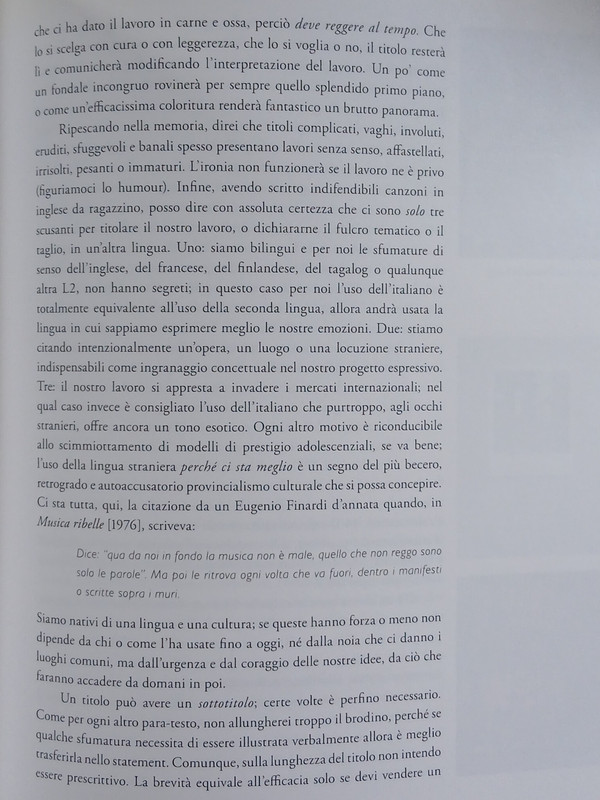 Dalla prima immagine postata da Andrea: Il titolo però può trasformarsi nel più grottesco e truculento suicidio espressivo che si sia mai visto. “ Vale sempre fare una riflessione, ma spesso riviste o gallerie internazionali richiedono titoli e descrizione del progetto in inglese „ Non mi stupisco, noi siamo la provincia dell'impero, ma forse tutte le province messe insieme sono più grandi dell'impero stesso. |