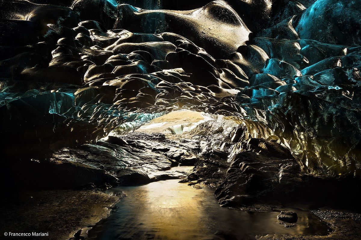 Sempre nel Parco nazionale di Skaftafell siamo riusciti a visitare una grotta di ghiaccio. La grotta è stata una bella scoperta, le venature bluastre viravano al celeste dove la luce le colpiva maggiormente creando un'atmosfera magica. La caverna, anche se piccola, presentava parecchi spunti fotografici. Dopo esserci rimasto quasi per quasi un'ora, poco prima di ripartire, da una delle due entrate è iniziata a filtrare la luce del sole che tramontava aggiungendo a quei magnifici colori freddi un'atmosfera surreale. MI trovavo, di fatto, all'interno di un antro magico pieno di pietre preziose, tanto che da un momento all'altro mi sarei aspettato la comparsa di qualche troll, geloso dei propri tesori e pronto a difenderli.
