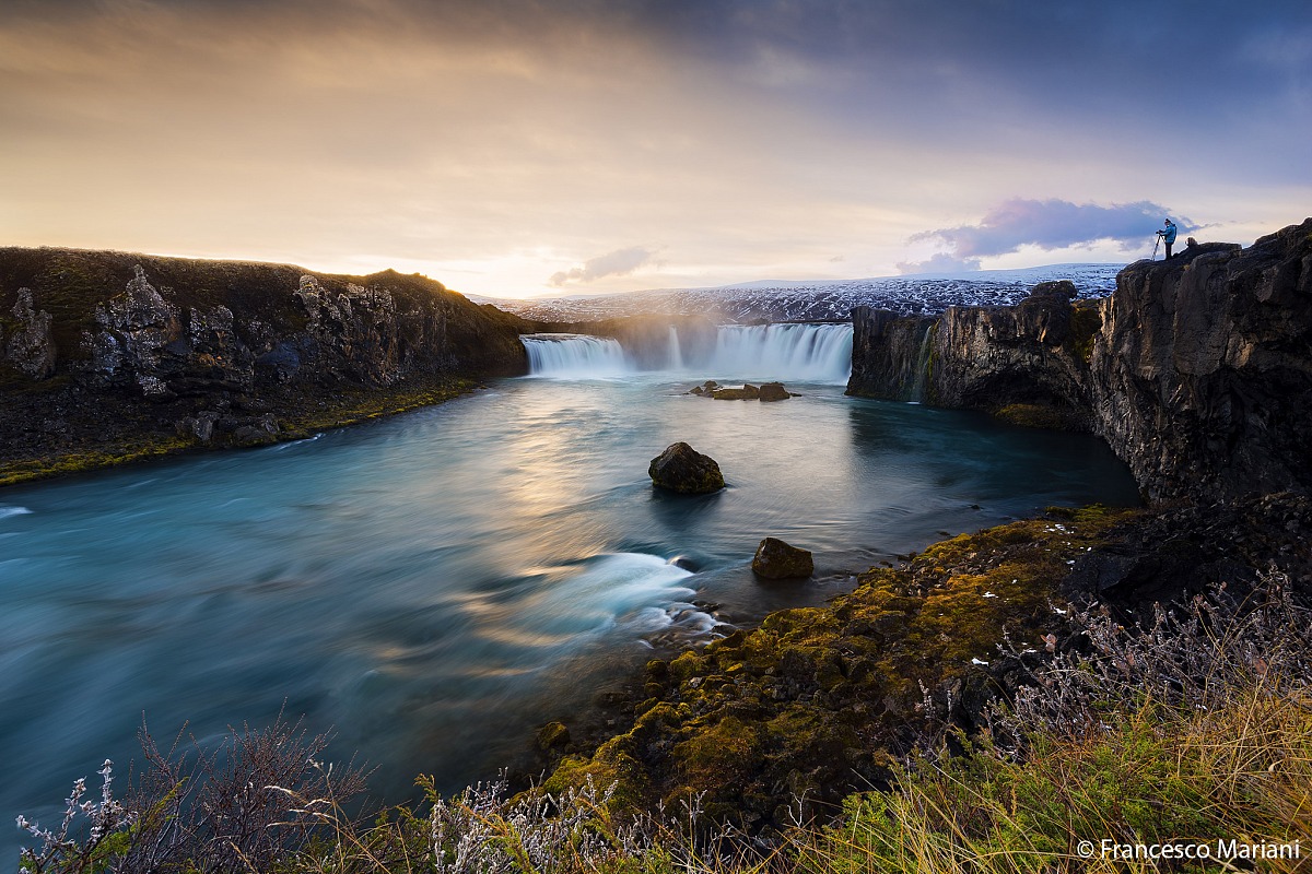 Questa cascata è molto famosa e ampliamente fotografata, ho cercato un'inquadratura che andasse al di là dei soliti scatti "classici" e devo dire che sono stato decisamente fortunato avendo goduto di un tramonto più che discreto e una bella aurora la stessa notte.