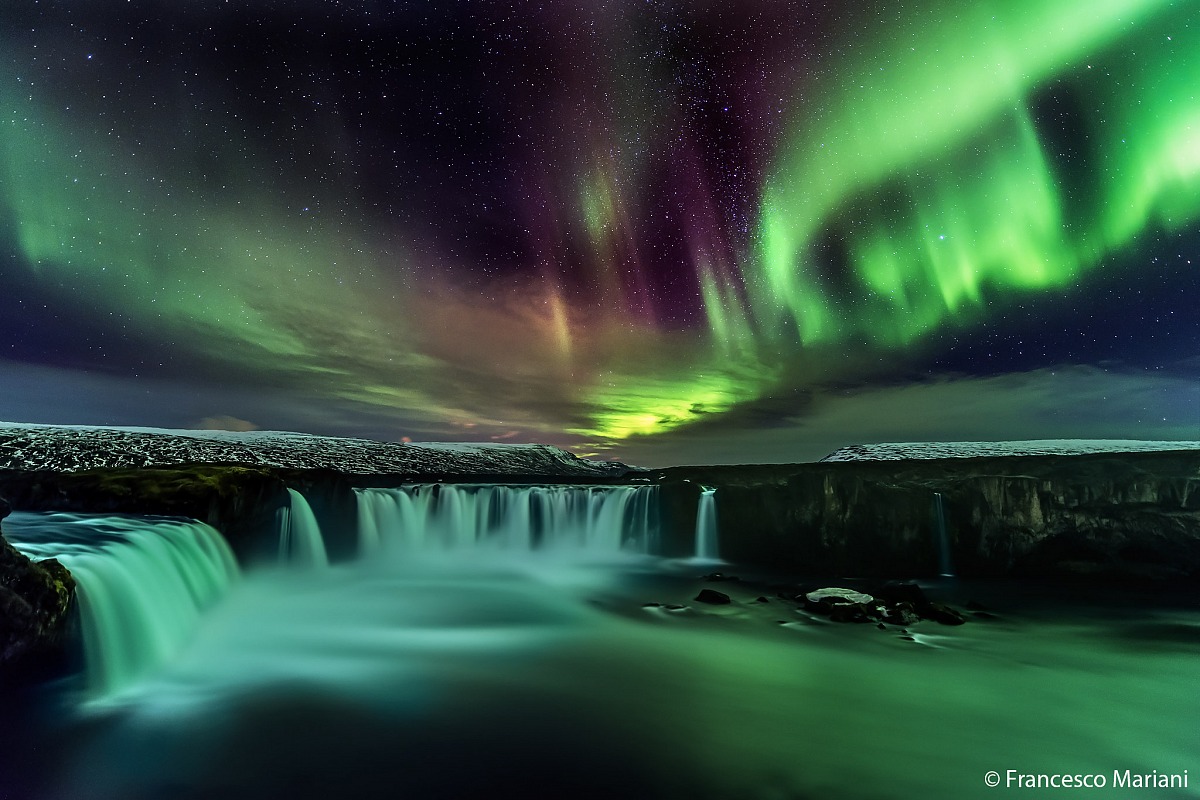 La notte di questo scatto il cielo sopra Akureyri (una delle poche città del nord) era limpido, dopo una veloce cena a base di pasta e sughi portati dall'Italia siamo tornati a Godafoss nella speranza di rivedere l'aurora: Un paio d'ore di attesa e siamo stati ripagati con una delle più belle di tutto il viaggio.