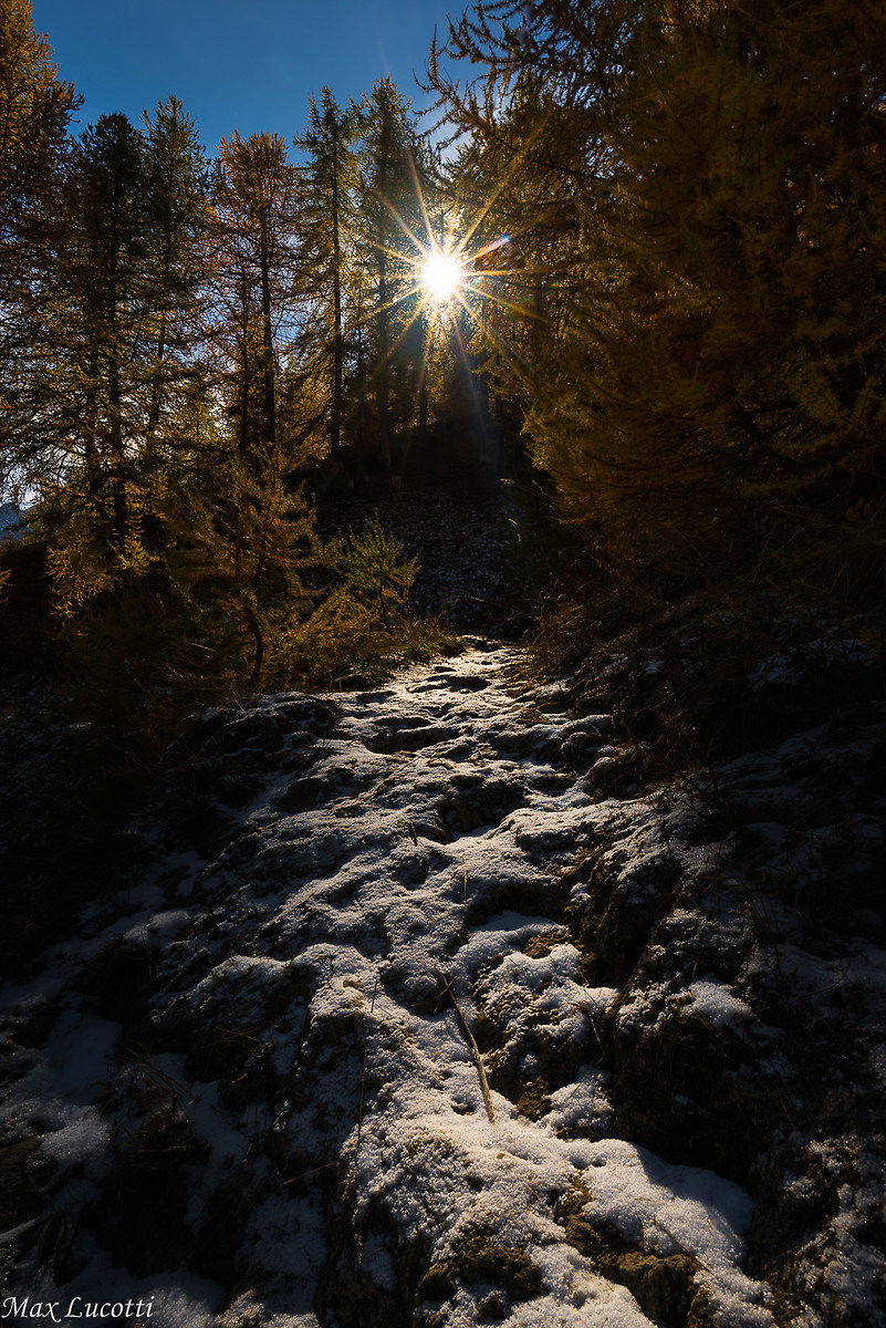 Che meraviglia i larici in autunno colpiti dal sole, sembrano fatti di oro. Alcuni poi sono immensi, alti, maestosi, mentre man mano che si sale di quota diventano più radi e piccoli. Impronte sulla neve, devono avere qualche giorno. Hanno la forma di quelle di un grosso cane, ma non si vedono quelle del padrone, e salgono nella mia stessa direzione seguendo il sentiero. Sono certamente l'unico a passare di qui dall'ultima nevicata.