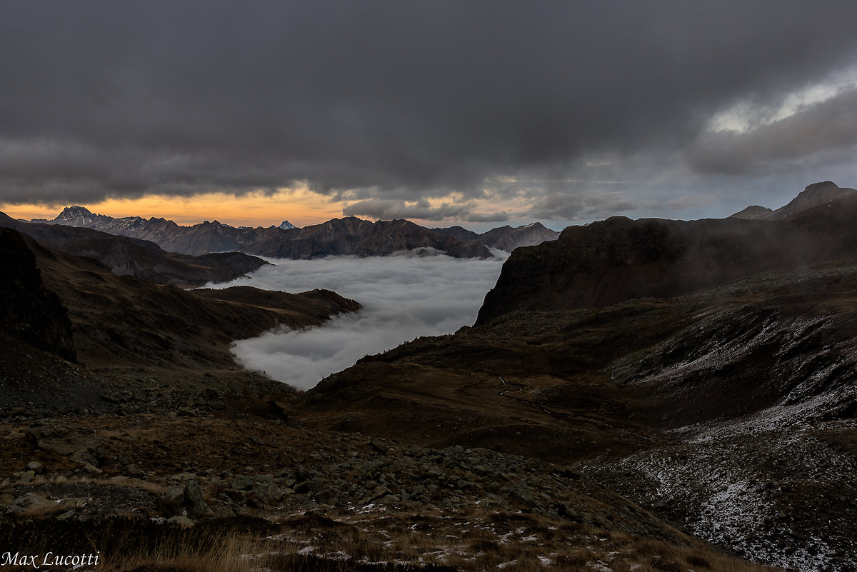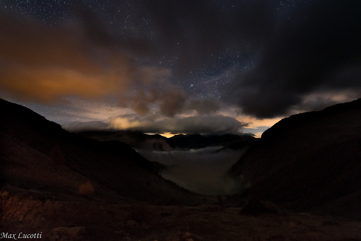 Che spettacolo e che emozione, queste situazioni ogni volta che mi capitano mi lasciano sempre in estasi. Il paesaggio è completamente cambiato, non c'è più il campo base nè i boschi di larici, e il sentiero sparisce inghiottito tra le soffici nuvole in costante movimento come onde nel mare. In lontananza lo spartiacque tra la valle Stura di Demonte e la Maira, dove svettano imponenti l'Oronaye e il Monviso, tra una striscia di calda luce del tramonto e il grigio della perturbazione. La luce stà calando sempre di più ed è giunta l'ora della discesa verso la tenda.