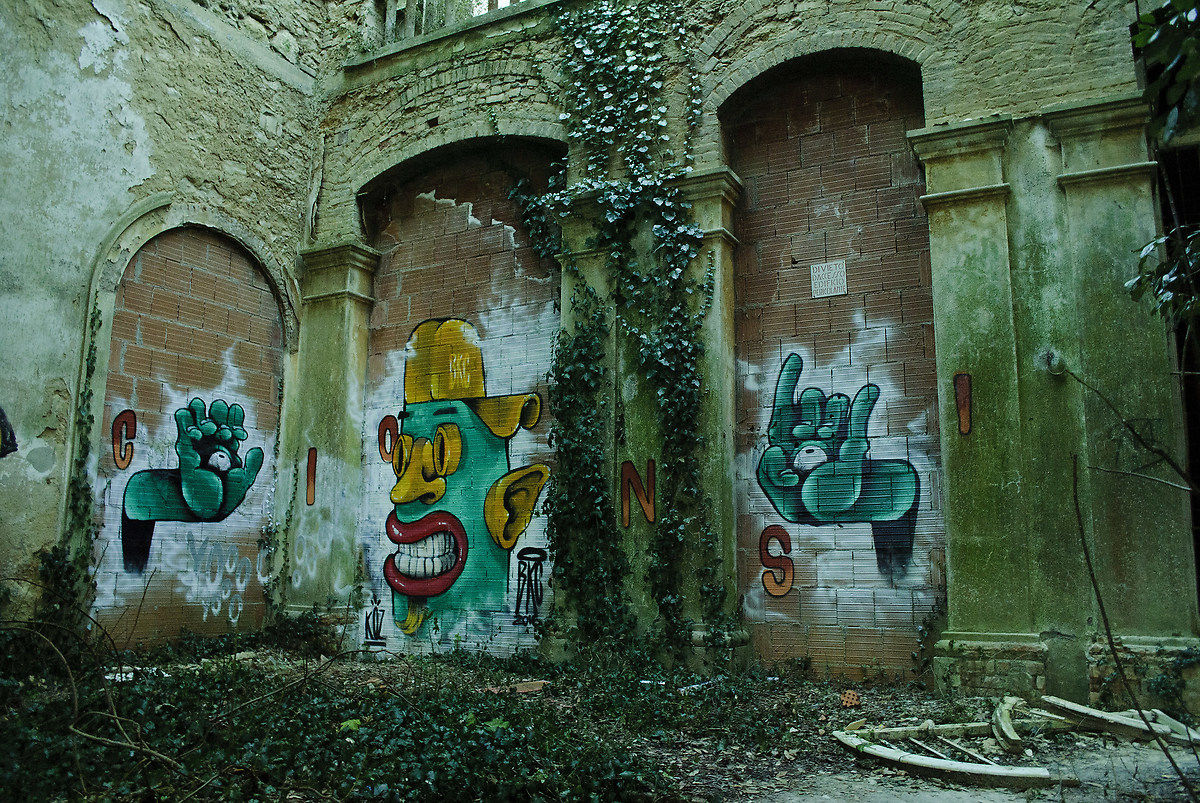Grandi finestre a arco, perfino belle nella loro architettura con gran uso di archi, ma tutte sbarrate da solide inferriate. L'esterno è oramai un intreccio di piante e rovi, l'edera si è abbarbicata sulle pareti, finestre e porte sono oramai un lontano ricordo ma la struttura si staglia ancora nella sua imponenza. Unica nota di colore un murales a una delle pareti….