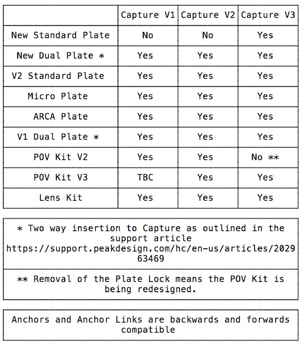 Peak Design Capture V3 - Compatibility table “ Compatibility Chart Many have asked about cross-compatibility between Capture v3 and previous versions of Capture. The short answer is: All previous plates (except POV Kit) work with Capture v3 The new Standard Plate does NOT work with previous Capture versions The new Dual Plate does work with all previous Capture versions Capture v3 does NOT work with previous Pro Pad versions Here's a handy chart to lay out the differences and cross-compatibility between old and new plates. We went ahead and added this to the project page. „ “ What if I have a bunch of older Capture clips? If you have Capture v2 or v1 units that you want to hold onto (after all, they're built to last—and guaranteed for—a lifetime) your best bet is to get Capture (clip only) + Dual Plate. Then you'll have a new clip, plus a new plate that is backwards compatible with your other gear. Instructions on how to do that are below in the Manfrotto Users section. „ |