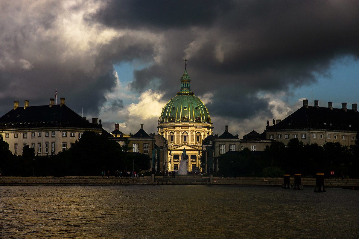 Per vedere Copenaghen da un'altra prospettiva si può fare un giro in battello. Io ho usato quello di linea. Purtroppo fotografare dal finestrino non dà sempre i risultati aspettati, ma c'è il vantaggio di essere riparati dalla pioggia, perché gli acquazzoni a Copenaghen non mancano! Ecco quindi davanti ai miei occhi la Frederiks Kirke meglio nota come Marmorkirken (Chiesa marmorea). Ha una maestosa cupola, di colore verde chiaro , poggiata su 12 colonne, ampia circa 31 metri, liberamente ispirata alla cupola di San Pietro a Roma. L'ingresso alla chiesa è libero e giunti sotto la cupola si rimane davvero per un attimo a contemplarla con il naso all'insù. Per dissapori tra l'architetto e lo scultore chiamato a realizzare le statue che dovevano ornare la chiesa, questi le fece troppo grandi per essere ospitate nelle nicchie e così furono poste all'esterno. Mentre ero comodamente seduta sul battello, intenta a chiacchierare, vedere la cupola spuntare, inaspettata, sotto un cielo cupo, mi ha fatto premere il pulsante di scatto all'istante!