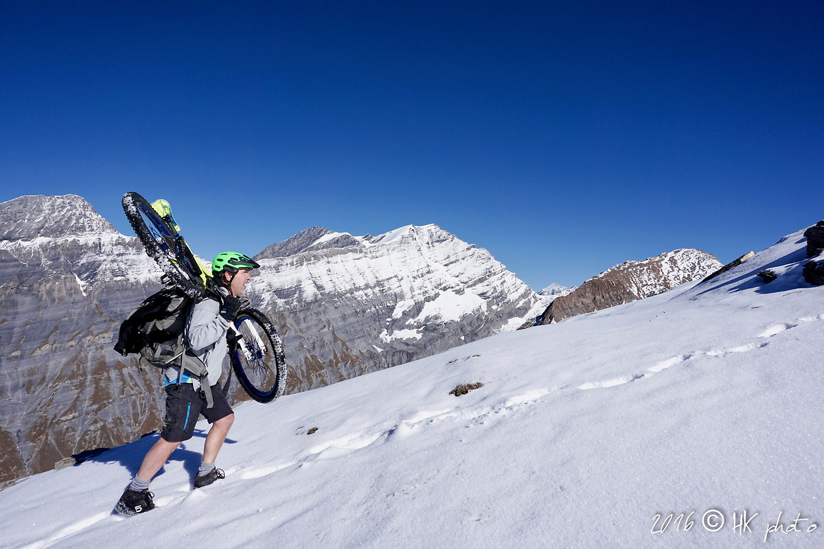 Non c' è molto da pedalare, dopo un primo tratto di raccordo la mulattiera di servizio a quelle che tra un mese saranno le piste da sci di Lekerbad TAKASU' dritta e le pendenze si fanno subito feroci. La stradina si trasforma in sentiero e quindi ci si carica la bike in groppa e tra una chiacchiera e qualche scatto raggiungiamo la cresta innevata.