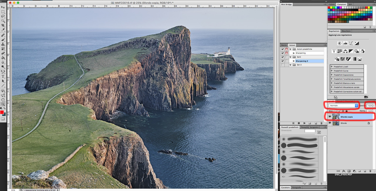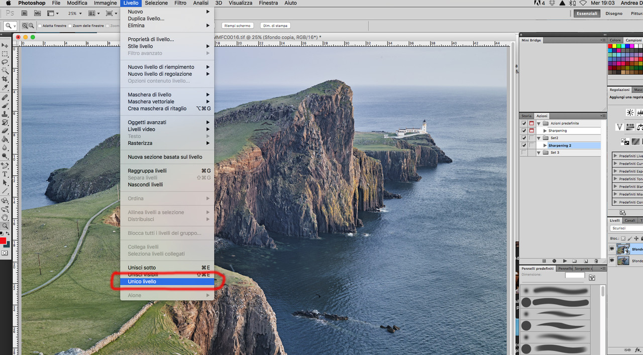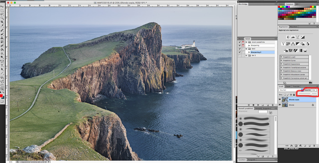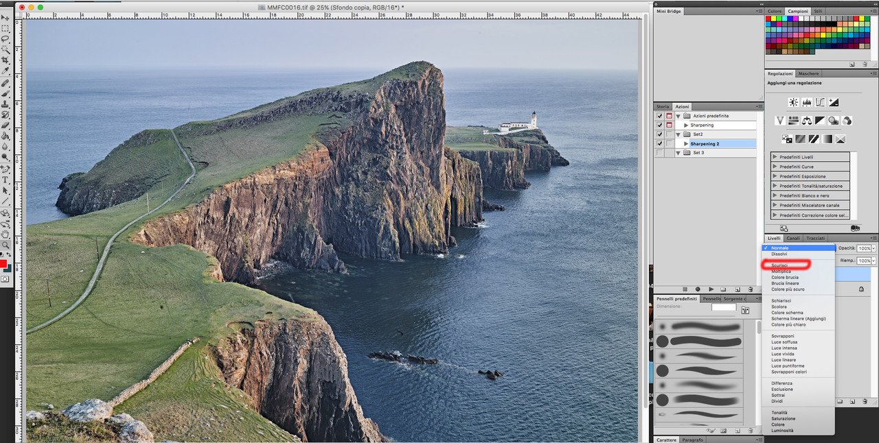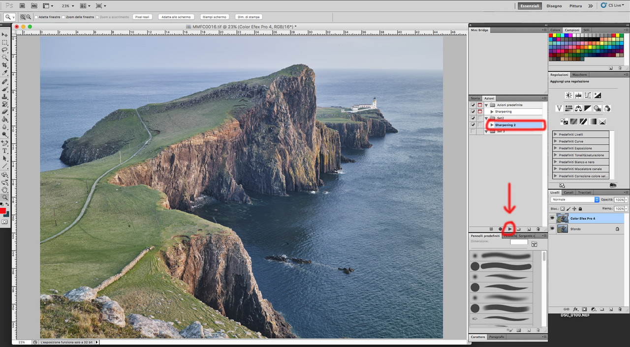 A questo punto faccio tutte le mie regolazioni del caso, fino a considerare la pp finita, ora, come ultima operazione, richiamiamo la nostra azione così: andiamo su azioni e troviamo sharpening e sharpening 2, in questo caso seleziono sharpening 2 e premo il tasto "play" per far partire l'azione.