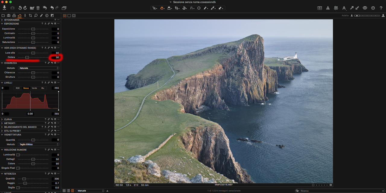 Se so che utilizzerò il metodo scurisci per evitare aloni, prima di convertire il raw, provvederò ad aprire un po' le ombre preventivamente, in questo caso le ho aperte di 30 punti su C1