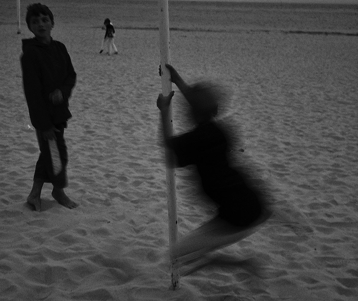 www.juzaphoto.com/galleria.php?l=it&t=1881147 La fotografia è presentata in bianco e nero. Questa foto dal punto di vista formale presenta un taglio forse anomalo o forse è in 4/3. Questo probabilmente crea qualche problema di bilanciamento di volumi e spazi a destra, lasciando una sorta di triangolo vuoto in alto. La restante parte appare invece davvero perfetta. La tavolozza di sabbia è ben dipinta dei volumi dei neri dei soggetti, ritagliati senza sovrapposizione alcuna tra i bianchi dei pali. L'occhio non ha difficoltà alcuna ad individuare gli elementi protagonisti e comprimari. Il bianco e nero è ruvido, con un deciso richiamo alla vecchia pellicola. La forte presenza di grana-rumore è assolutamente funzionale. Aiuta a ricostruire l'atmosfera e il contesto di ciò che mostra. Ci una indica che probabilmente siamo in prossimità di un tardo pomeriggio, o comunque un momento, una situazione di luce crepuscolare e come meglio della grana-rumore può essere rappresentato? Personalmente non ne conosco altri. La scena che si presenta è un bel racconto racchiuso dentro al titolo. La diagonale tra il bambino che ruota attorno al palo ed il bambino che guarda fuori campo ha molta forza e motivo di interesse per chi osserva l'immagine. Primaria importanza per spazio ha ovviamente il bambino in primo piano che, mentre si trattiene con la mani al palo, effettua una rotazione che il mosso contribuisce a restituirne il movimento. Non meno importanza e forza ha il volto dell'altro bambino. Ciò che può apparire come n difetto, ossia la mancanza di luminosità sul viso, è in realtà una forza di quel punto. Ci dobbiamo concentrare meglio per comprendere l'espressione, che però una volta trovata diventa assolutamente protagonista. Il tutto si amalgama con le residue figure sullo sfondo, che arricchiscono il contesto e la scena. Una fotografia da un forte contenuto estetico, dalla assoluta atemporalità di luogo e momento, che mi piace moltissimo e che per il tema trattato metto nello stesso cassetto della mia memoria assieme ad un'altra che ben ricordo, ma questa è una storia che non interessa. Una fotografia che ben rappresenta un racconto del quotidiano, una storia con molti spazi di libertà per chi osserva ed interpreta. Un buon esempio di come l'imperfezione sia pressochè irrilevante quanto la foto ha molta forza. Un buon esempio di come mezzi, attrezzatura e ricerca di perfezioni contino poco o nulla per raccontare qualcosa. Un buon esempio per me per cercare motivi di riflessione. |