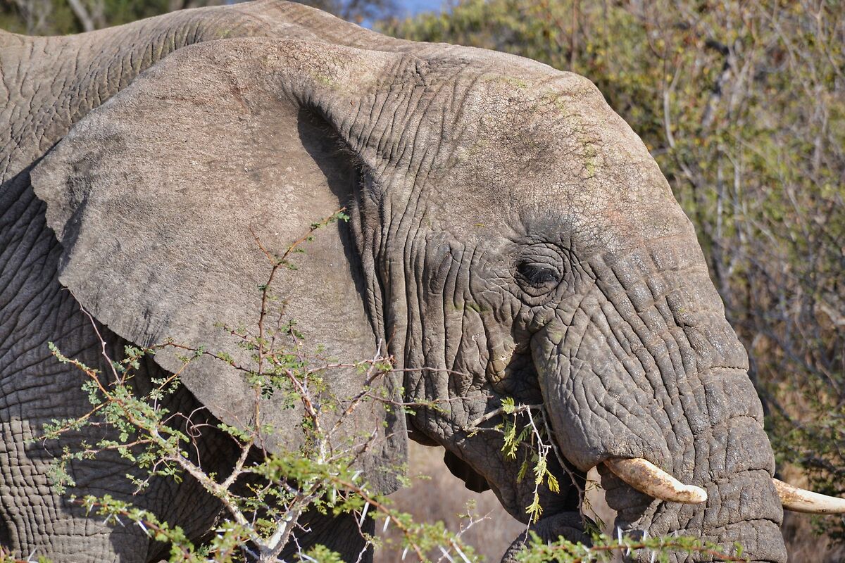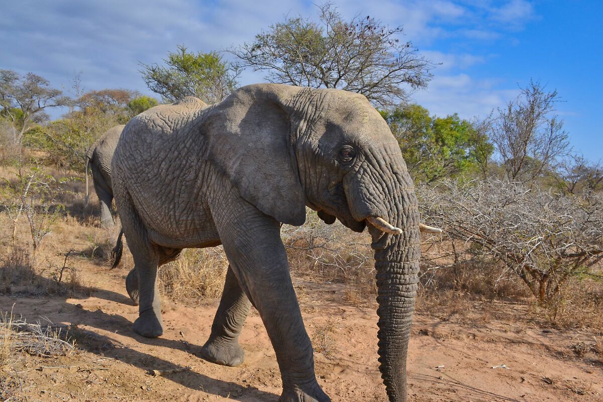 “ Se invece vai nei parchi privati tipo Sudafrica, spesso volentieri per una buona foto basta anche il 300 ( se vuoi però fare primi piani o scatti particolari, torniamo ai 400/500mm necessari ) . In questa occasione l'auto esce dalla pista e va molto vicino all'animale e attenzione...molto utile anche un grandangolo o comunque un ottica molto corta perchè capita spesso che l'animale cammini verso la jeep e ti passi molto ma molto vicino... „ Esatto, molto importante dove si effettua il safari. Sono stato nella riserva privata Kapama, nel Kruger Park del Sudafrica, e con il Nikon 18-140 f/3.5-5.6 (e una basica D3100) sono riuscito a portare a casa qualche immagine interessante (avevo meno attrezzatura ed esperienza di quanta ne abbia ora, che già è poca...). Questa foto l'ho scattata con una focale di 18mm (27mm equivalente su ff), l'elefante era a pochi metri: