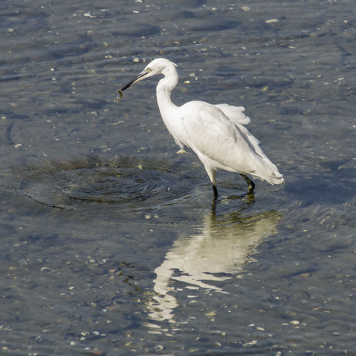 Qui fotografavo, sempre con il traking, la garzetta che zampettava nell'acqua bassa per beccare dei pesciolini col lungo becco: