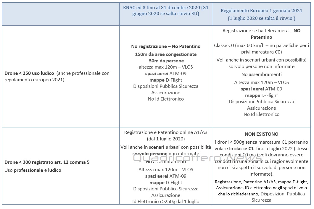 Durden, la distinzione è ancora tra uso ludico e professionale. Secondo la nuova normativa, il pilota per condurre un drone rispondente all'art 12 comma 5 doveva conseguire il cosiddetto patentino online entro il 1 luglio 2020. Per aderire a tale categoria, fino al 29 febbraio doveva essere compilata la dichiarazione di rispondenza per le operazioni specializzate. A partire dal 1 marzo 2020 tutti dovranno registrarsi sul sito d-flight applicando il relativo QR-Code sul drone.(QN) Covid permettendo. Sul fatto che debbano uscire dal supermercato con giù un QR di riconoscimento sono del tutto daccordo. |