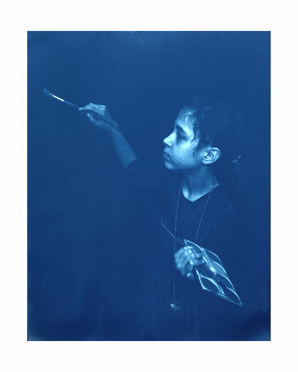 Per chi non la conoscesse, la cianotipia è una tecnica di stampa fotografica inventata dallo scienziato e astronomo inglese Sir John Herschel nel 1842. Due sali, il ferricianuro di potassio e il citrato ferrico ammoniacale, mescolati assieme producono una soluzione sensibile ai raggi ultravioletti. Frapponendo un negativo tra la luce del Sole e un foglio di carta su cui è stata applicata la soluzione ai sali ferrici, si produce un'immagine fotografica.