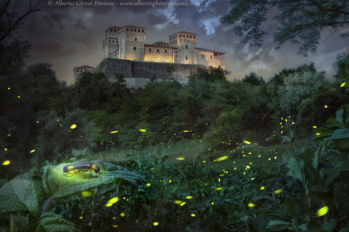 2 serie di focus stacking: il primo è una serie di 5 immagini a f/8; 15s; ISO4000 per la zona della lucciola in primo piano; il secondo è una serie di 40 immagini a f/11; 30s e ISO3200 per la zona dietro alla lucciola. 1 bracketing finale di 5 scatti per il recupero delle alte luci sul Castello di Torrechiara.