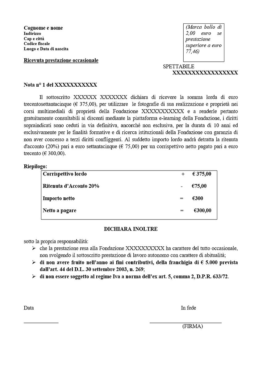 “ Avresti per caso un fac-simile da mostrarmi??? „ Ho lavorato spesso con ritenuta d'acconto questa è l'ultima, per il prezzo chiesi 375 lordi per tre foto che avevo già scattato per altri scopi e che avevano già dato frutto