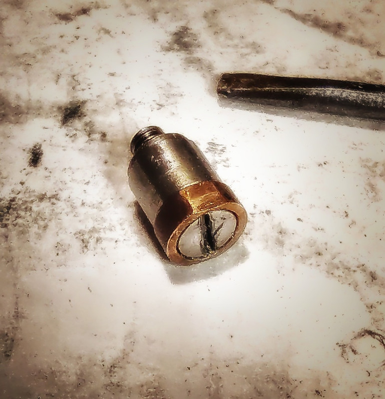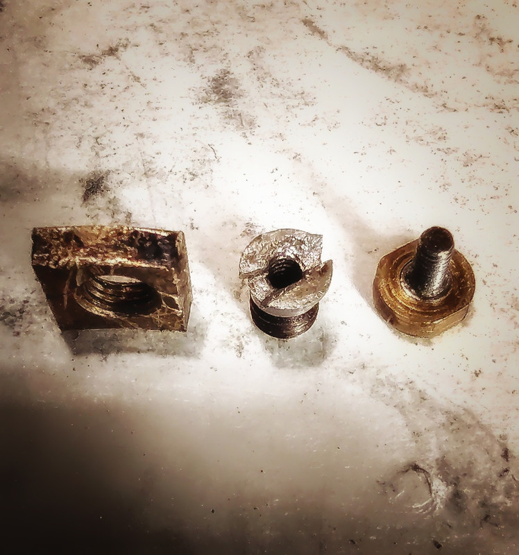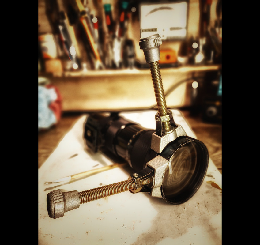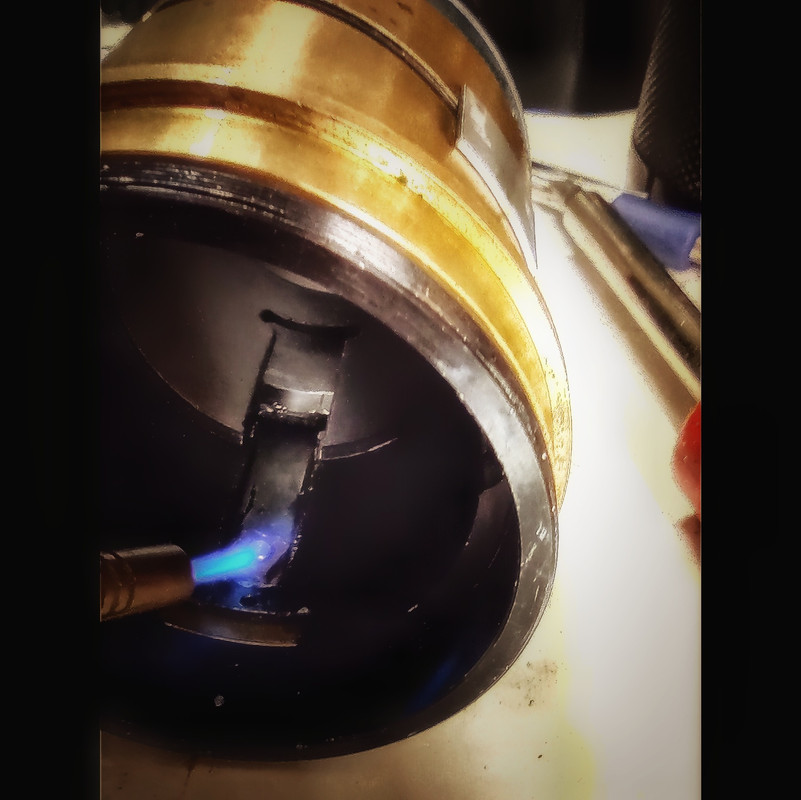 2) avuto l'accesso all'interno, dovevo arrivare al cuore del meccanismo di zoom, ed occorreva svitare dei nottolini di ottone, uno dei quali era assicurato ad un bullone quadrato interno bloccato da un frenafiletti chiaramente della stessa origine aliena del precedente. Insensibile alla chimica ed irraggiungibile dall'azione di qualsiasi pinza che consentisse abbastanza forza per svitarlo, l'ho attaccato con una piccola fiamma ossidrica: il calore ha sciolto il collante e dilatato i metalli, consentendomi finalmente di liberarlo dall'infausto serraggio. Attacco termico !!!