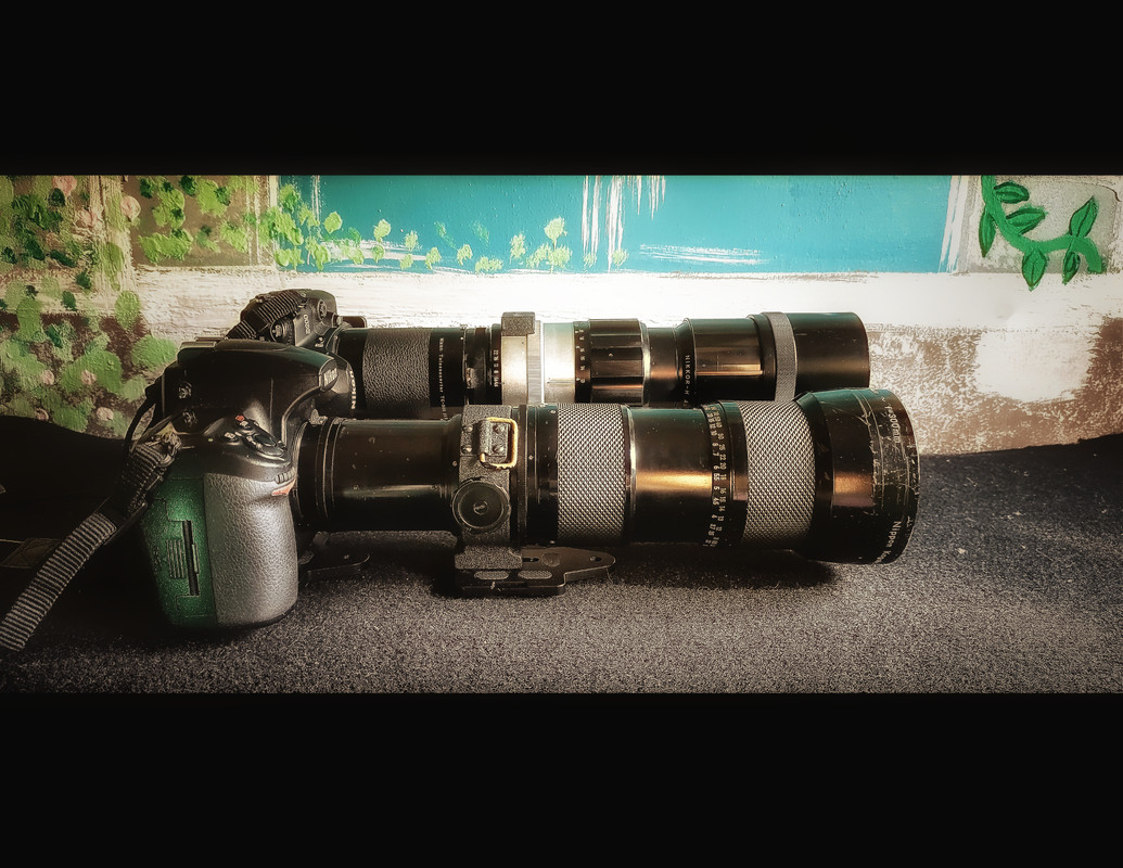 Anni fa comperai usato per soli 195 € un monumentale Nikkor 50-300 f 4,5 del 1968: era il sogno di una vita, un obiettivo che all'epoca costituiva il meglio del meglio di quanto Nikon riuscisse a progettare e produrre, di quando le case avevano un prestigio da difendere gagliardamente ed orgoglio da sbandierare in faccia ai concorrenti e meno l'ossessione per il profitto. Attualizzando il prezzo d'acquisto, oggi verrebbe circa 18.000 euro... Il basso prezzo che pagai era giustificato da rilevanti danni alla complicata meccanica interna e funghi dentro il nocciolo. Ma fuori si presentava tutto sommato bene. Lo riparai come potevo ma mancavo d'esperienza percio', tolti i funghi, lo rimisi sullo scaffale in attesa di tempi migliori. Dopo aver sbudellato abbastanza obiettivi, mi sono sentito pronto alla sfida, adottando metodi finalmente adeguati alle difficolta' che mi si presentavano davanti.... Ecco il signorino in primo piano, davanti ad un 300-H con TC300.