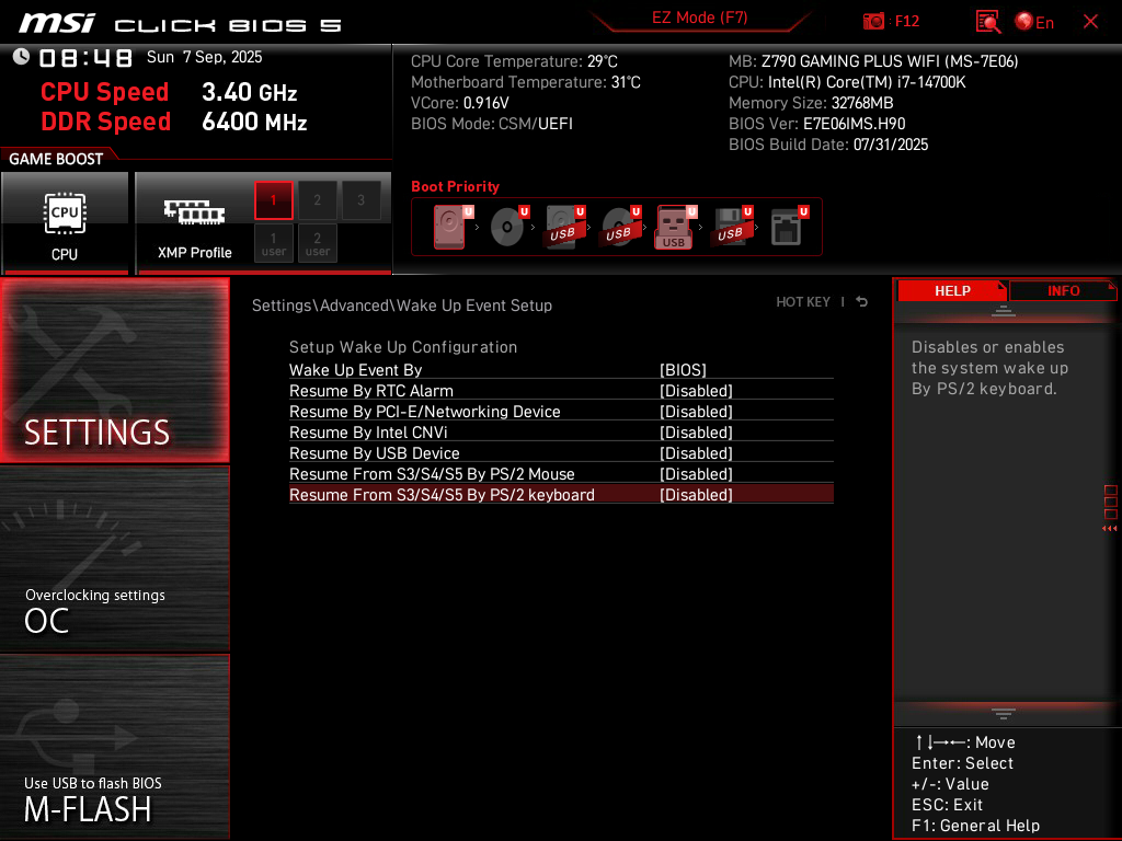 Sia il Controller delle porte USB, sia l'accensione dell PC è gestita dalla linea +5V. Per qualche motivo, succede che, se imposti che le porte USB rimangono accese con il PC in S5, ti va tilt tutta la linea +5v e di conseguenza il PC non si accende. Poi, quando togli l'alimentazione per un po di tempo, il Controller si resetta è il PC riparte normalmente. Se il PC, una volta accesso non ti dà problemi, ti invito a seguire il consiglio di Kepler. Quindi, sul sito MSI vedi se c'è un aggiornamento del BIOS, Microcode e Firmware ed eseguili. Altro suggerimento è quello di entrare nel BIOS, vai in Settings -> Adavanced -> Power Management Setup, e disabilita la funzione ErP Ready. Ti lascio uno screen preso dal BIOS del mio PC