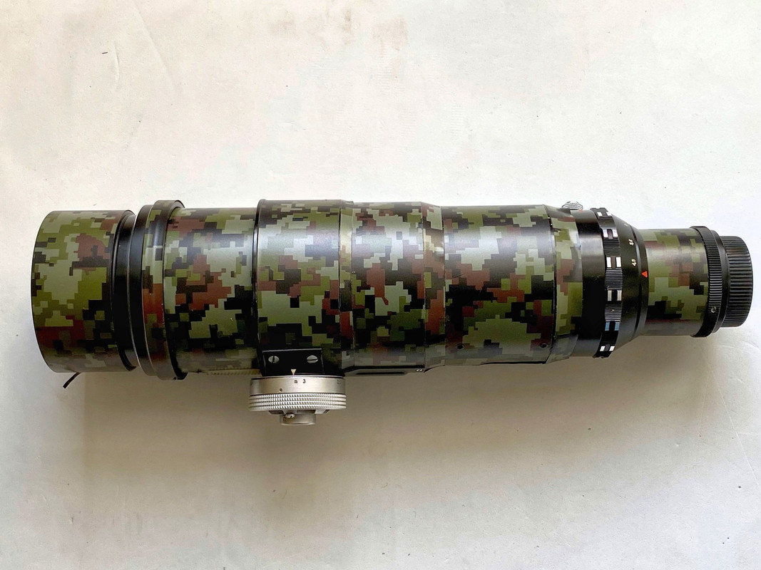 [/IMG] Vi sono due modi per applicare uno skin ad un obiettivo: 1) : usare il neoprene delle mute da sub. Vantaggi: protegge molto bene dagli urti, può essere anche mimetico. Svantaggi: non facile da tagliare/incollare, ha un certo spessore per cui non è applicabile sulla parte telescopica per la messa a fuoco dell'ottica. 2) : usare le skin applicabili alle carrozzerie delle automobili. Vantaggi: facili da ritagliare/applicare. Rimovibili. Economiche. Con un po' di ricerca, si trovano anche schemi mimetici carini o effetto carbonio. Si possono applicare anche sulla parte telescopica, data la sottigliezza (vedere la foto). Svantaggi: non proteggono dagli urti. L'obiettivo della foto è l'onnipresente Tair 300 da fotofucile, al quale ho sostituito il paraluce originale in gomma con uno metallico, anch'esso rivestito con skin mimetico. |