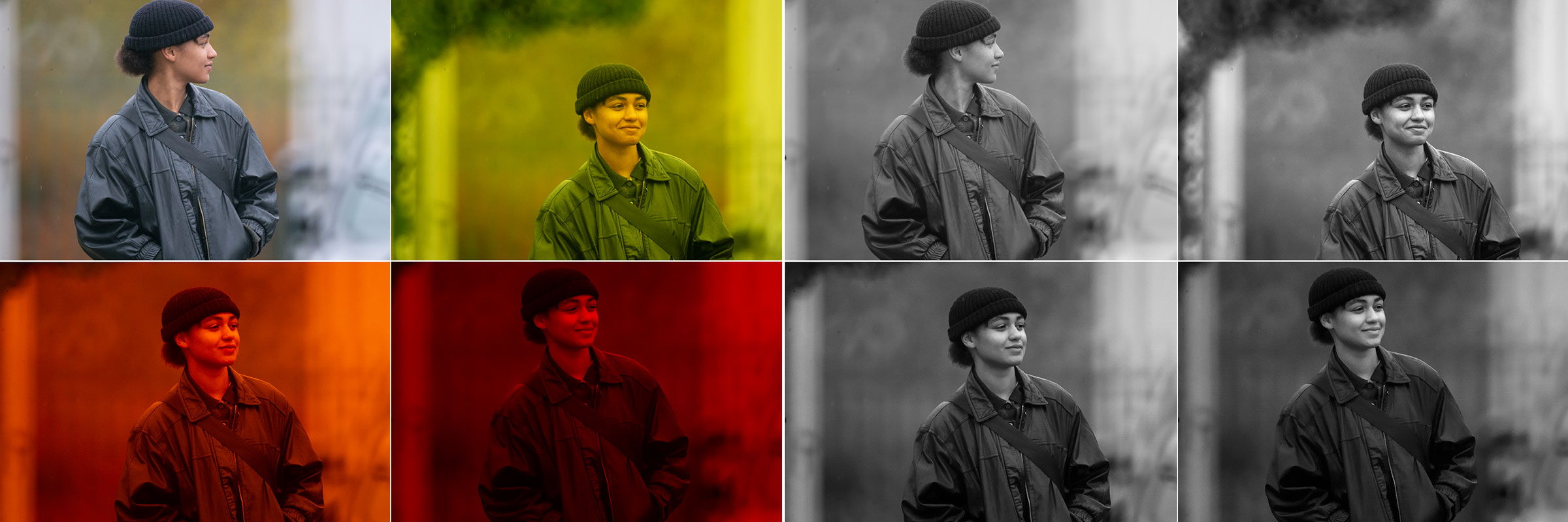 A sinistra, l'effetto dei vari filtri (scattando con una moderna fotocamera digitale); a destra il risultato che si otterrebbe con pellicola bianco e nero.