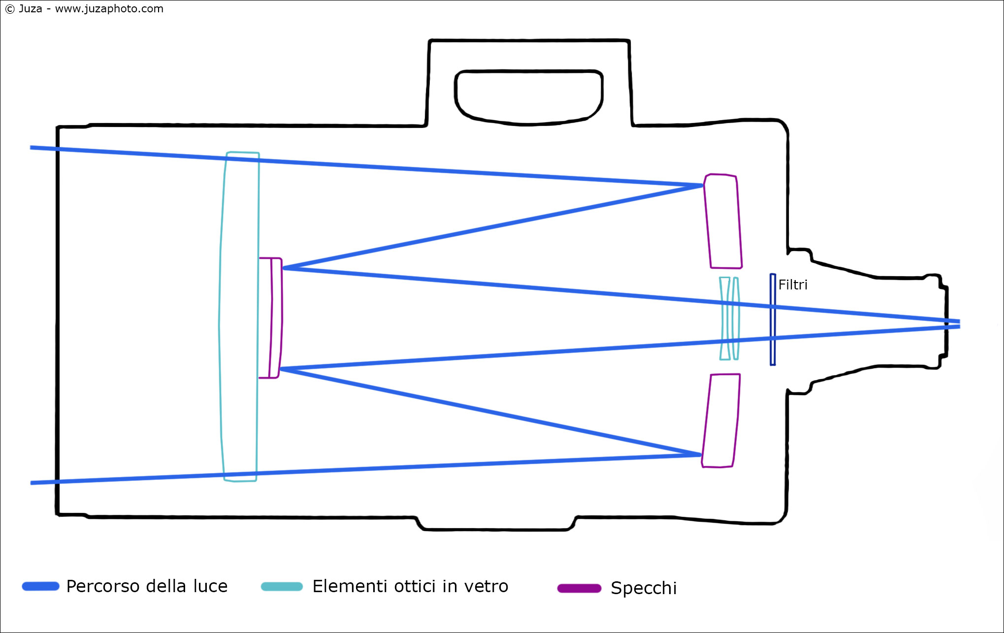 Come possiamo vedere nell'illustrazione qui sopra, la luce rimbalza tra gli specchi del 2000 mm, permettendo di ottenere una focale lunghissima con una lunghezza ragionevole. Lo schema ottico mostrato qui sopra è quello del 2000 mm, ma il principio illustrato vale per tutte le ottiche catadiottriche. A titolo di curiosità, questo schema a cinque elementi è identico a quello del Nikon 1000mm f/11: Nikon aveva sviluppato per primo il 1000mm, ottica ben più piccola ed economica che al giorno d'oggi si può trovare nell'usato attorno ai 400-500 euro; per il 2000mm ha "semplicemente" raddoppiato le dimensioni.