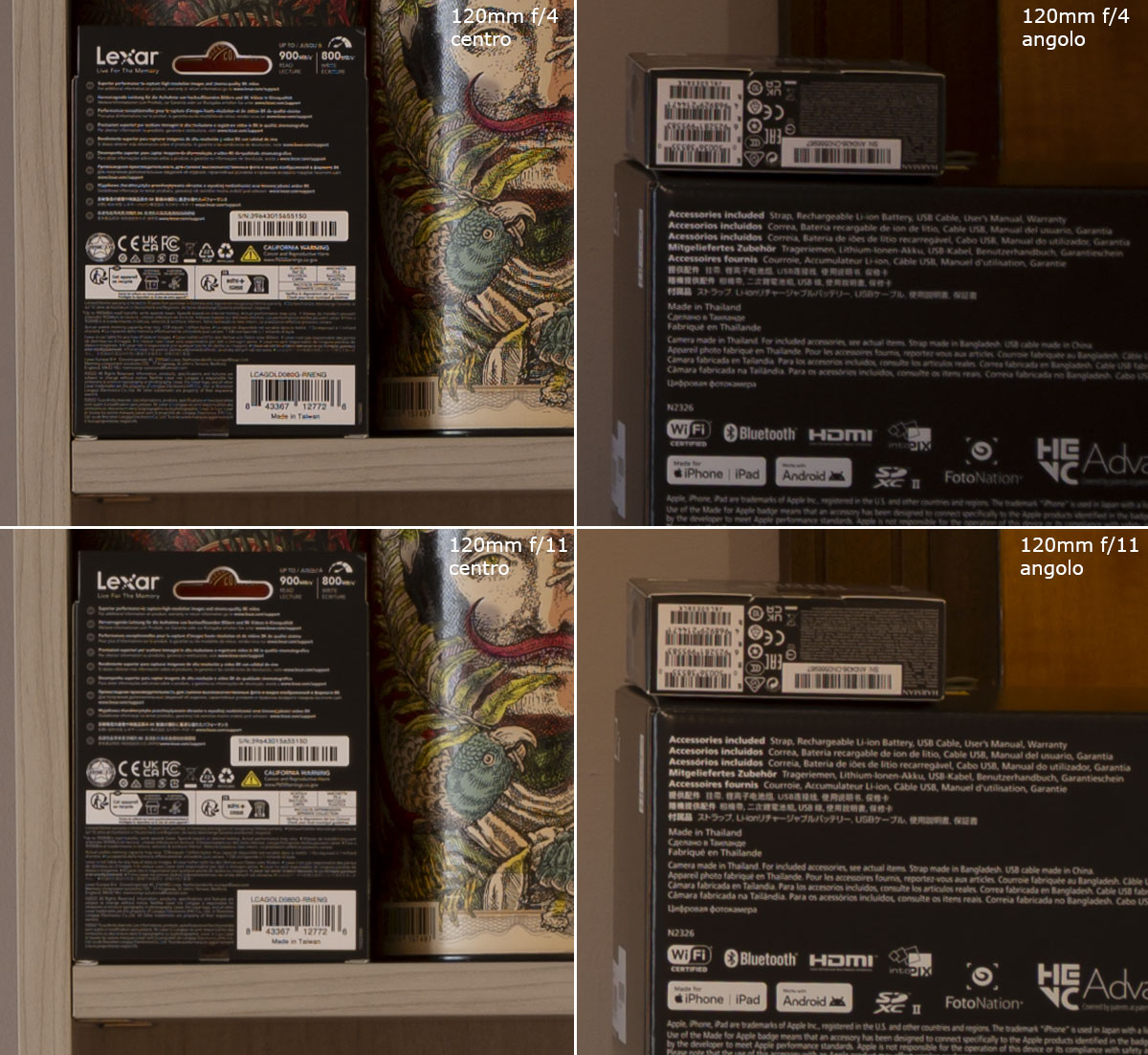 Ho testato il Nikon Z 24-120 f/4S sul sensore FF da 24 megapixel della Nikon Z5 II. Ho testato l'obiettivo scattando alle focali principali (24mm, 35mm, 50mm, 85mm e 120mm) e ai due diaframmi che considero più significativi su un'ottica del genere: f/4, importante per l'utilizzo in poca luce o in ambito street e ritratto, e f/11, il diaframma che utilizzo di più nella fotografia paesaggistica o in altri ambiti dove serve un'estesa profondità di campo, dato che offre un'ottima combinazione tra profondità di campo e nitidezza (da f/16 in poi sui sensori si comincia a notare la perdita dovuta alla diffrazione). Vediamo come sempre i ritagli al 100% dal file RAW; cominciamo dalla resa a 24mm.